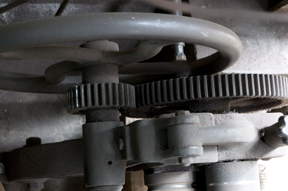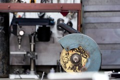 今回訪問させていただいたのは、立売堀アートニクスビルの南側一階にアトリエを構える、2006年設立の「LOOP various metal art」花里政信氏の工房。錆びた鉄で作られた重厚な扉を開くと、見た事のないような様々な機械が整然と並べられている。